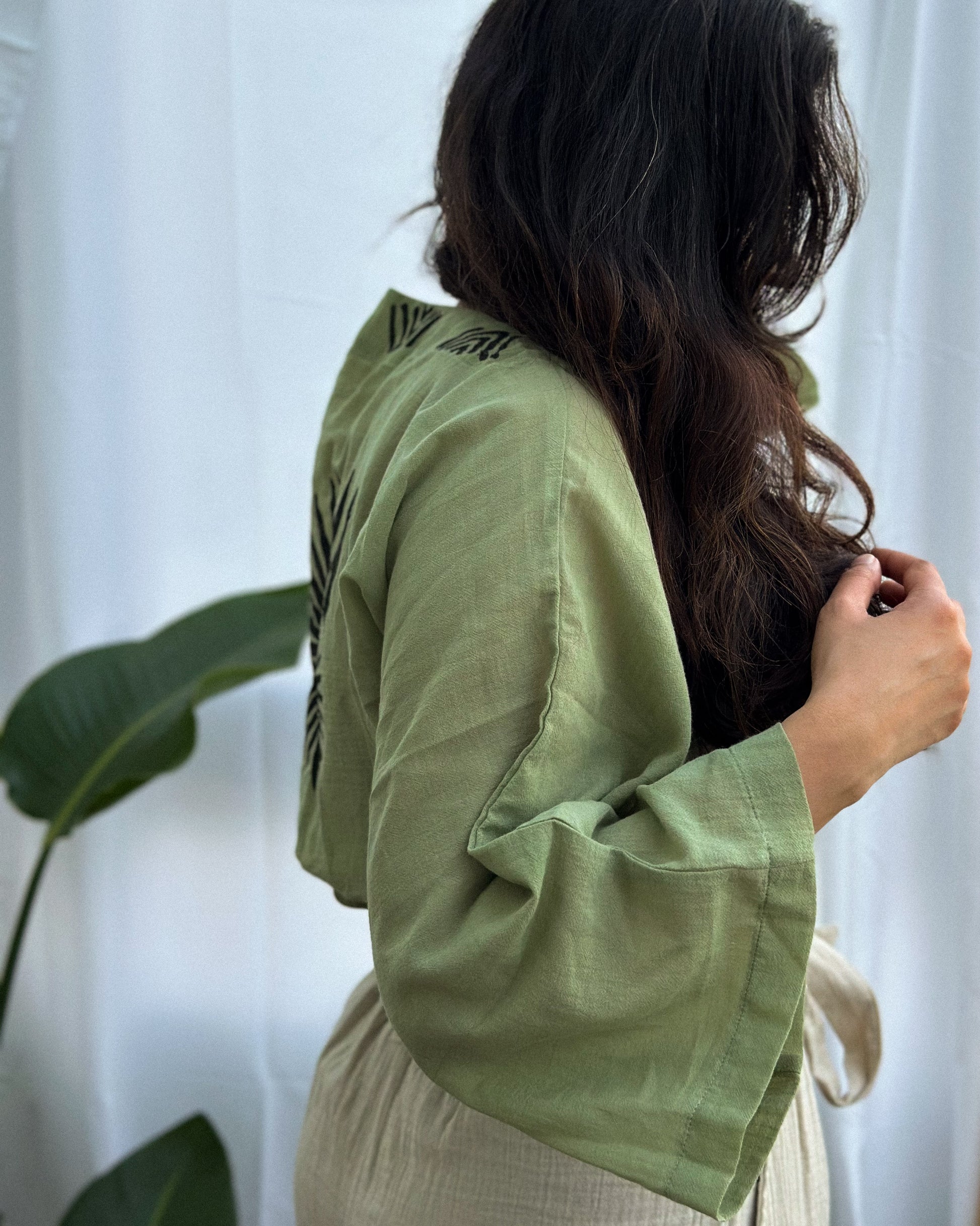 This unique crop top features a handcrafted woodblock print.