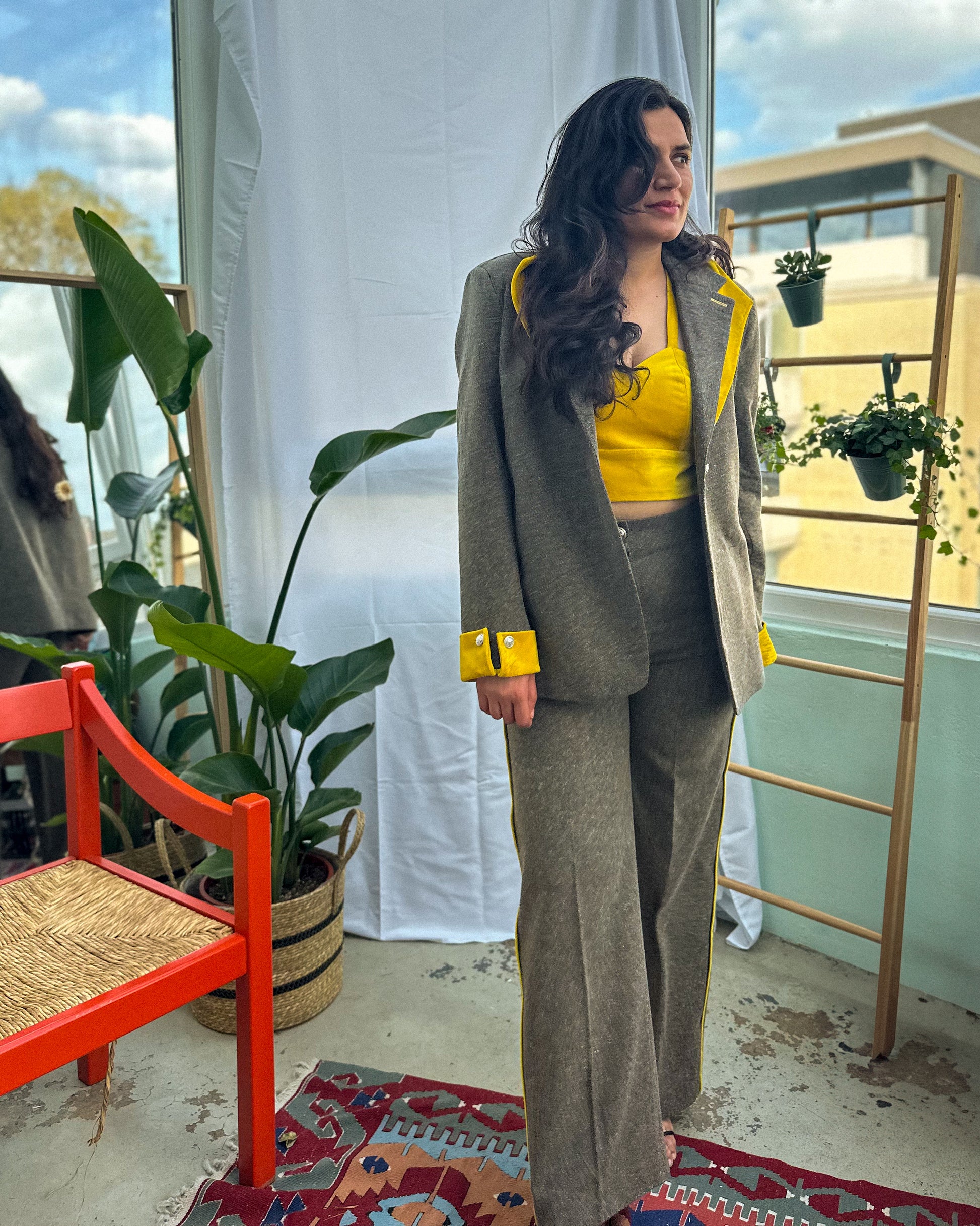 The oversized suit (one blazer, one trousers) is designed as one size.